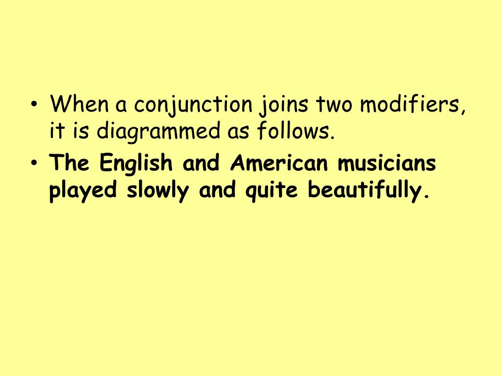 When a conjunction joins two modifiers, it is diagrammed as follows. • The English and American musicians played slowly and quite beautifully.