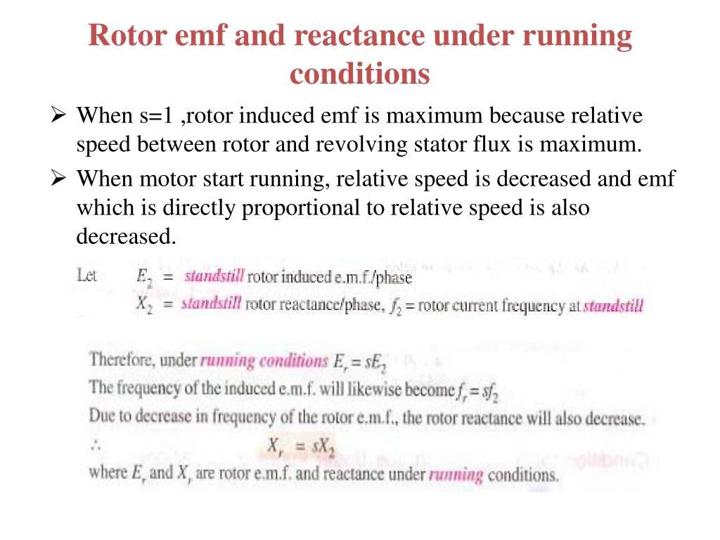 Rotor emf and reactance under running conditions • When s=1 ,rotor induced emf is maximum because relative speed between rotor and revolving stator flux is maximum. • When motor start running, relative speed is decreased and emf which is directly proportional to relative speed is also decreased.