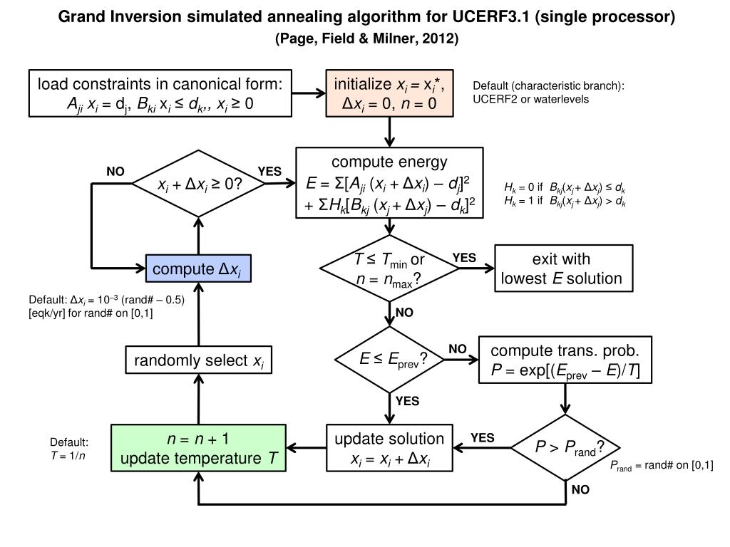Grand Inversion simulated annealing algorithm for UCERF3.1 (single processor)(Page, Field & Milner, 2012) load constraints in canonical form: Aji xi = dj, Bki xi ≤dk,, xi ≥ 0 initialize xi = xi*, Δxi = 0, n = 0 Default (characteristic branch): UCERF2 or waterlevels compute energy E = Σ[Aji (xi+ Δxi) – dj]2 + ΣHk[Bkj(xj+ Δxj) – dk]2 NO YES Hk= 0 if Bkj(xj+ Δxj) ≤ dk Hk = 1 if Bkj(xj+ Δxj) > dk T ≤Tminor n = nmax? xi+ Δxi ≥ 0? exit with lowest E solution YES compute Δxi Default: Δxi = 10–3 (rand# – 0.5) [eqk/yr] for rand# on [0,1] NO P >Prand? E≤Eprev? compute trans. prob. P = exp[(Eprev – E)/T] NO randomly select xi YES n = n + 1 update temperature T update solution xi= xi + Δxi YES Default: T = 1/n Prand = rand# on [0,1] NO