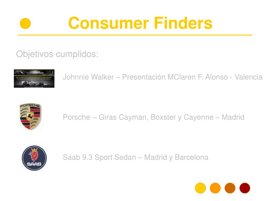 Consumer Finders Objetivos cumplidos: Johnnie Walker – Presentación MClaren F. Alonso - Valencia Porsche– Giras Cayman, Boxster y Cayenne – Madrid Saab 9.3 Sport Sedan – Madrid y Barcelona
