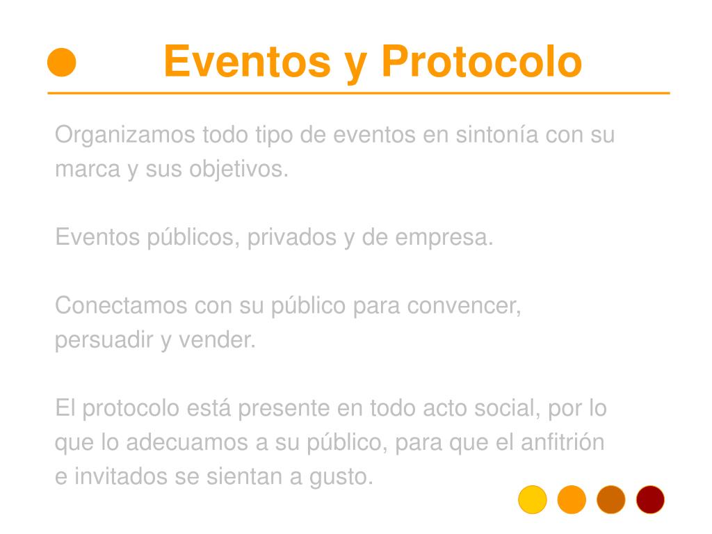 Eventos y Protocolo Organizamos todo tipo de eventos en sintonía con su marca y sus objetivos. Eventos públicos, privados y de empresa. Conectamos con su público para convencer, persuadir y vender. El protocolo está presente en todo acto social, por lo que lo adecuamos a su público, para que el anfitrión e invitados se sientan a gusto.