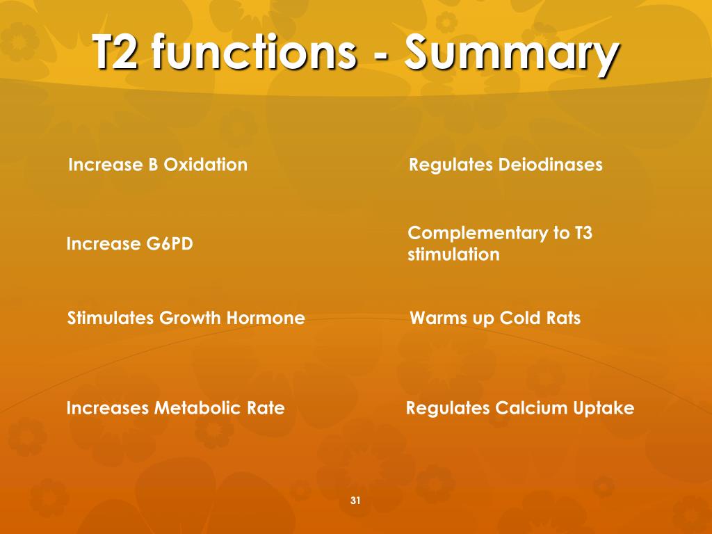 T2 functions - Summary Increase B Oxidation Regulates Deiodinases Complementary to T3 stimulation Increase G6PD Stimulates Growth Hormone Warms up Cold Rats Increases Metabolic Rate Regulates Calcium Uptake 31