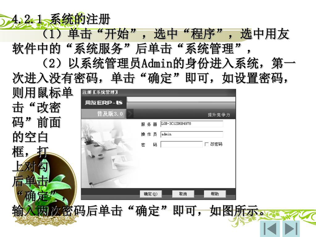 4.2.1 系统的注册 (1)单击“开始”,选中“程序”,选中用友软件中的“系统服务”后单击“系统管理”, (2)以系统管理员Admin的身份进入系统,第一次进入没有密码,单击“确定”即可,如设置密码,则用鼠标单 击“改密 码”前面 的空白 框,打 上对勾 后单击 “确定”, 输入两次密码后单击“确定”即可,如图所示。