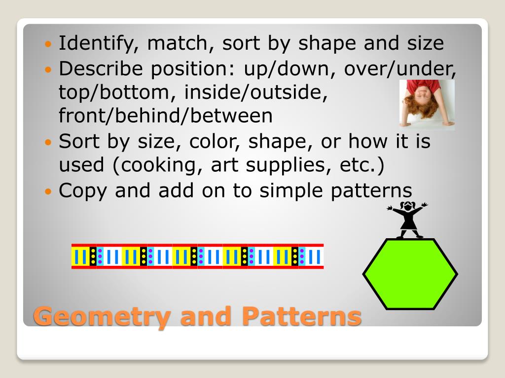 Identify, match, sort by shape and size • Describe position: up/down, over/under, top/bottom, inside/outside, front/behind/between • Sort by size, color, shape, or how it is used (cooking, art supplies, etc.) • Copy and add on to simple patterns Geometry and Patterns