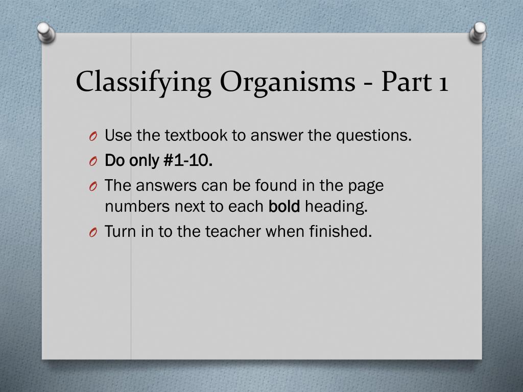 Classifying Organisms - Part 1 • Use the textbook to answer the questions. • Do only #1-10. • The answers can be found in the page numbers next to each bold heading. • Turn in to the teacher when finished.