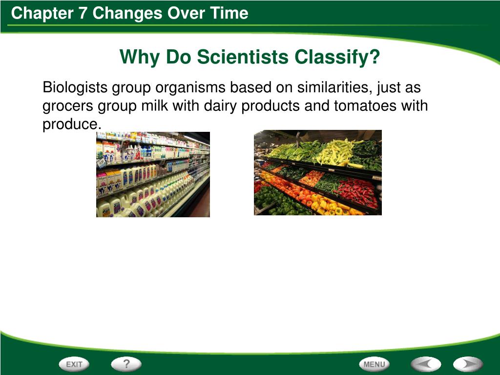 Why Do Scientists Classify? • Biologists group organisms based on similarities, just as grocers group milk with dairy products and tomatoes with produce.