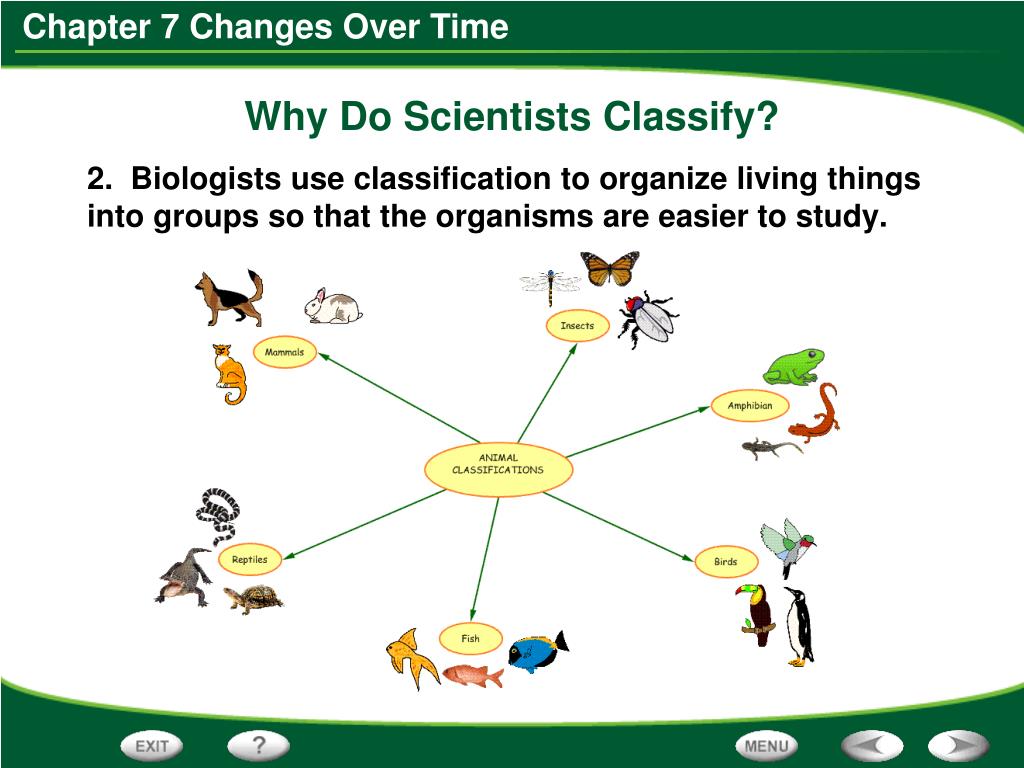 Why Do Scientists Classify? • 2. Biologists use classification to organize living things into groups so that the organisms are easier to study.