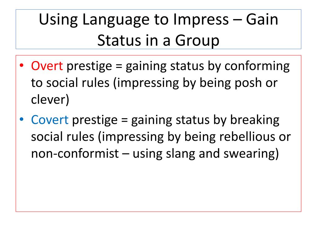 Using Language to Impress – Gain Status in a Group • Overt prestige = gaining status by conforming to social rules (impressing by being posh or clever) • Covert prestige = gaining status by breaking social rules (impressing by being rebellious or non-conformist – using slang and swearing)
