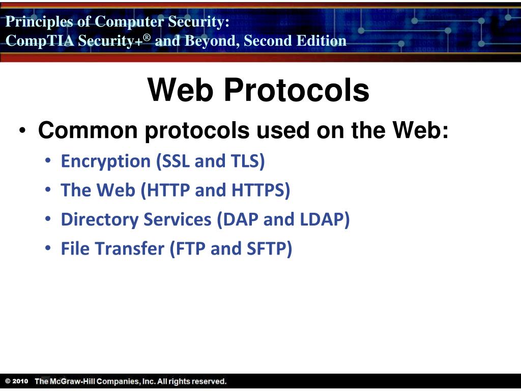 Web Protocols Common protocols used on the Web: Encryption (SSL and TLS) The Web (HTTP and HTTPS) Directory Services (DAP and LDAP) File Transfer (FTP and SFTP)