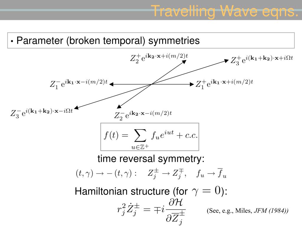 Travelling Wave eqns. • Parameter (broken temporal) symmetries time reversal symmetry: Hamiltonian structure (for ): (See, e.g., Miles,JFM (1984))