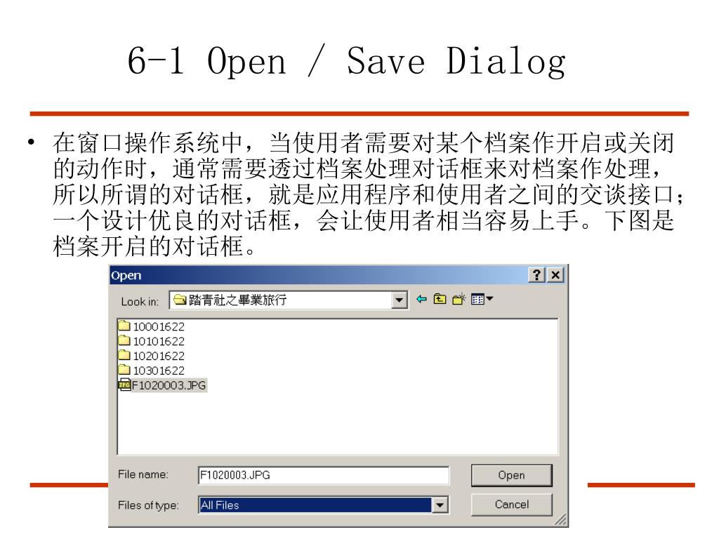 6-1 Open / Save Dialog • 在窗口操作系统中,当使用者需要对某个档案作开启或关闭的动作时,通常需要透过档案处理对话框来对档案作处理,所以所谓的对话框,就是应用程序和使用者之间的交谈接口;一个设计优良的对话框,会让使用者相当容易上手。下图是档案开启的对话框。