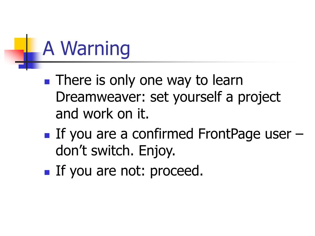 A Warning • There is only one way to learn Dreamweaver: set yourself a project and work on it. • If you are a confirmed FrontPage user – don’t switch. Enjoy. • If you are not: proceed.