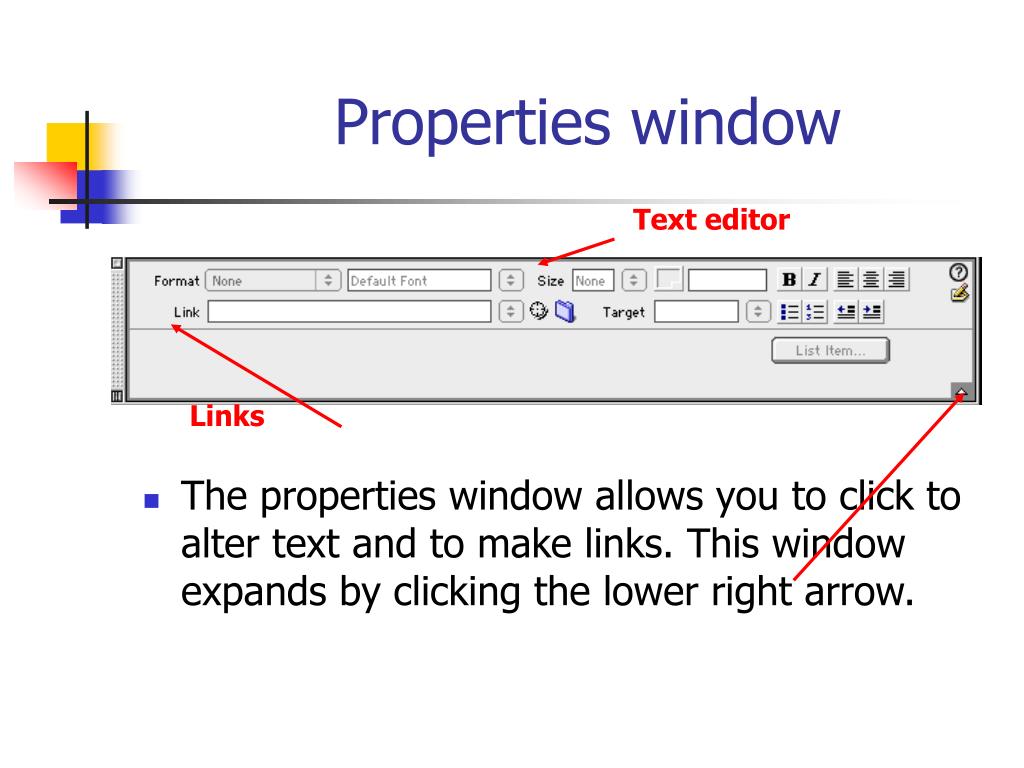 Properties window Text editor Links • The properties window allows you to click to alter text and to make links. This window expands by clicking the lower right arrow.