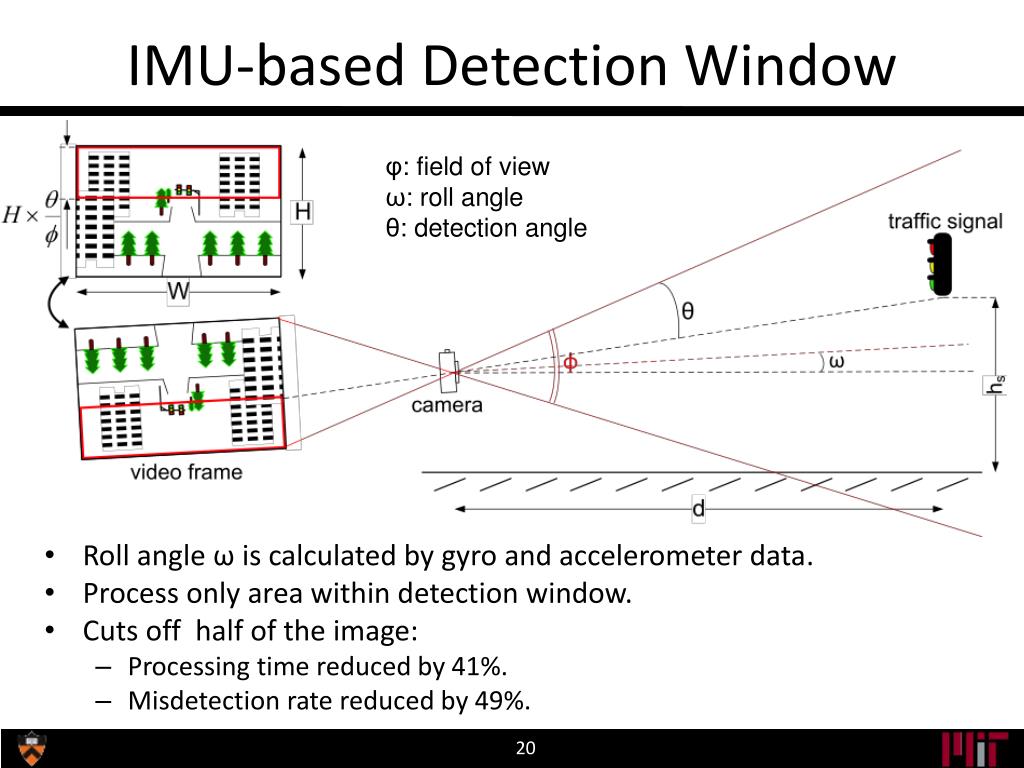 IMU-based Detection Window φ: field of view ω: roll angle θ: detection angle • Roll angle ω is calculated by gyro and accelerometer data. • Process only area within detection window. • Cuts off half of the image: • Processing time reduced by 41%. • Misdetection rate reduced by 49%.