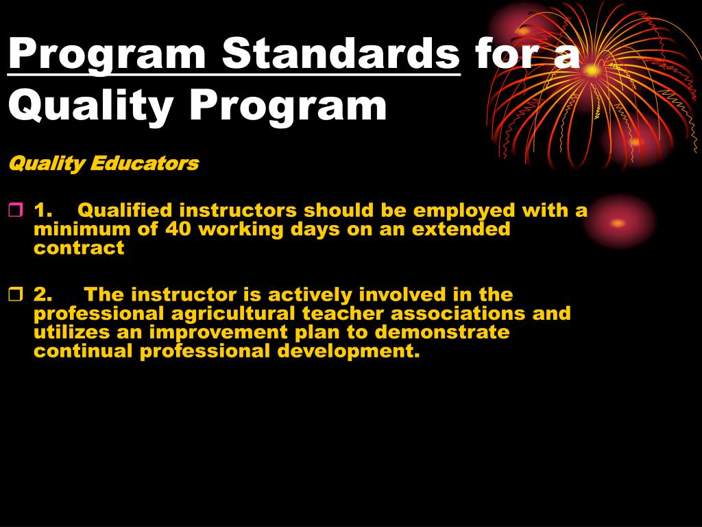 Program Standards for a Quality Program Quality Educators 1.Qualified instructors should be employed with a minimum of 40 working days on an extended contract 2. The instructor is actively involved in the professional agricultural teacher associations and utilizes an improvement plan to demonstrate continual professional development.