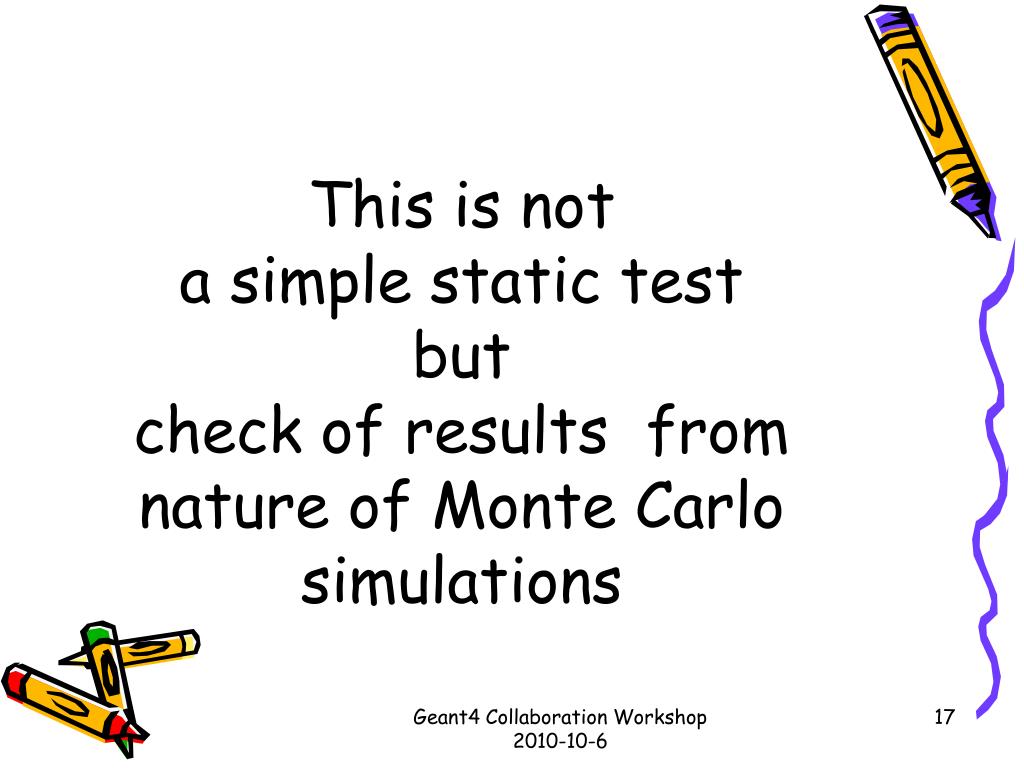 This is not a simple static testbutcheck of results from nature of Monte Carlo simulations Geant4 Collaboration Workshop 2010-10-6