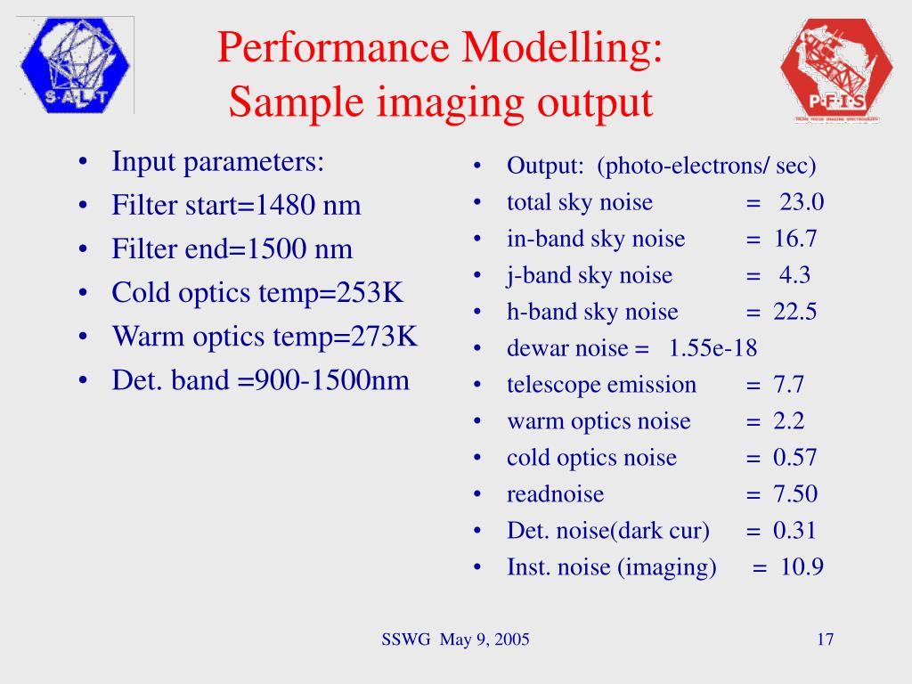 Performance Modelling:Sample imaging output • Input parameters: • Filter start=1480 nm • Filter end=1500 nm • Cold optics temp=253K • Warm optics temp=273K • Det. band =900-1500nm • Output: (photo-electrons/ sec) • total sky noise = 23.0 • in-band sky noise = 16.7 • j-band sky noise = 4.3 • h-band sky noise = 22.5 • dewar noise = 1.55e-18 • telescope emission = 7.7 • warm optics noise = 2.2 • cold optics noise = 0.57 • readnoise = 7.50 • Det. noise(dark cur) = 0.31 • Inst. noise (imaging) = 10.9 SSWG May 9, 2005