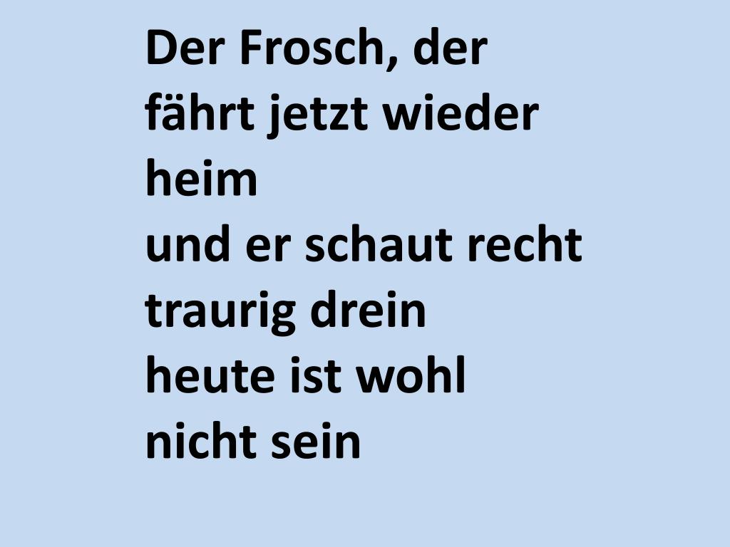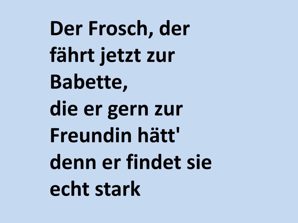 Der Frosch, der fährt jetzt zur Babette,die er gern zur Freundin hätt'denn er findet sie echt stark