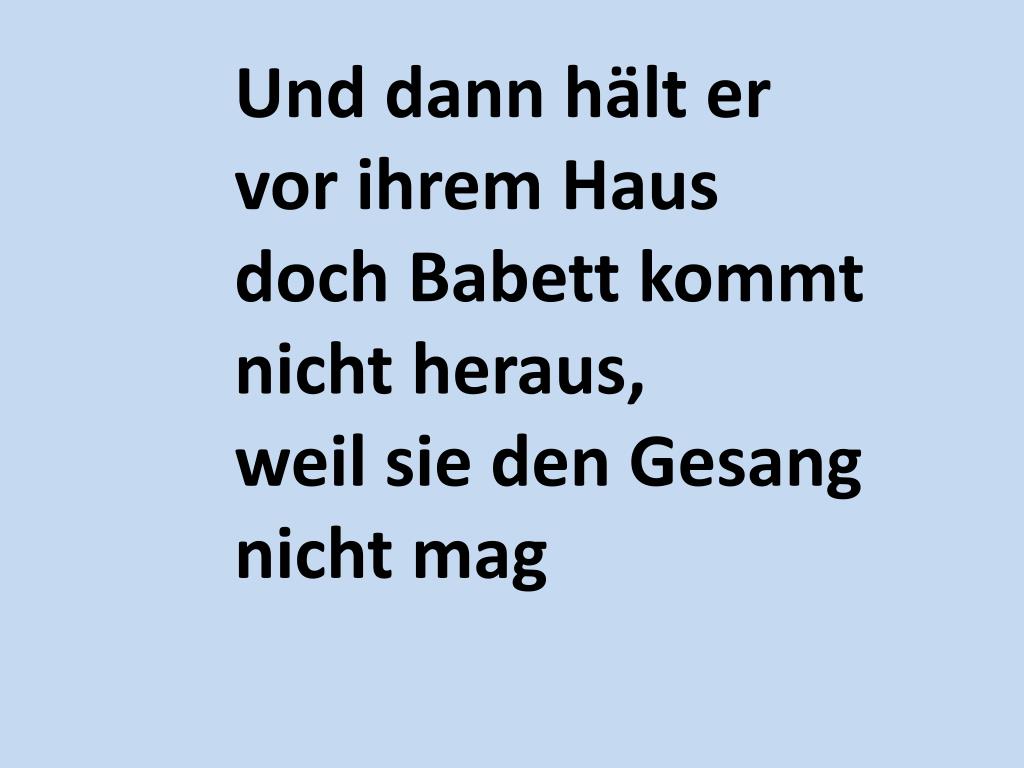 Und dann hält er vor ihrem Hausdoch Babett kommt nicht heraus,weil sie den Gesang nicht mag