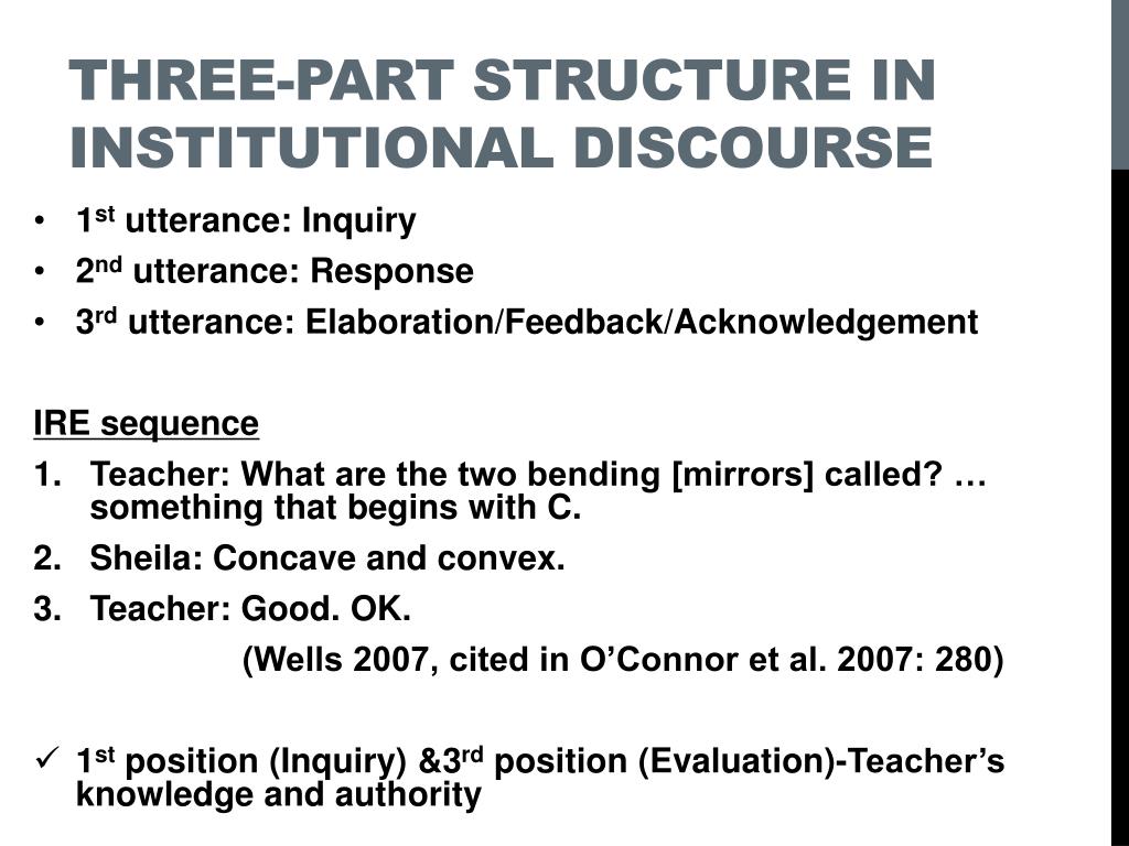 Three-part structure in institutional discourse • 1st utterance: Inquiry • 2nd utterance: Response • 3rd utterance: Elaboration/Feedback/Acknowledgement • IRE sequence • Teacher: What are the two bending [mirrors] called? … something that begins with C. • Sheila: Concave and convex. • Teacher: Good. OK. • (Wells 2007, cited in O’Connor et al. 2007: 280) • 1st position (Inquiry) &3rd position (Evaluation)-Teacher’s knowledge and authority