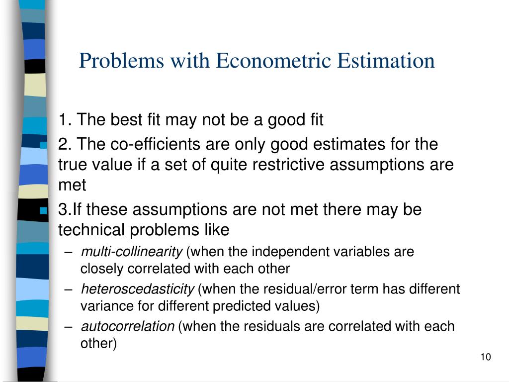 Problems with Econometric Estimation • 1. The best fit may not be a good fit • 2. The co-efficients are only good estimates for the true value if a set of quite restrictive assumptions are met • 3.If these assumptions are not met there may be technical problems like • multi-collinearity (when the independent variables are closely correlated with each other • heteroscedasticity (when the residual/error term has different variance for different predicted values) • autocorrelation (when the residuals are correlated with each other)