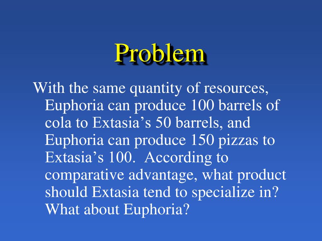 Problem • With the same quantity of resources, Euphoria can produce 100 barrels of cola to Extasia’s 50 barrels, and Euphoria can produce 150 pizzas to Extasia’s 100. According to comparative advantage, what product should Extasia tend to specialize in? What about Euphoria?