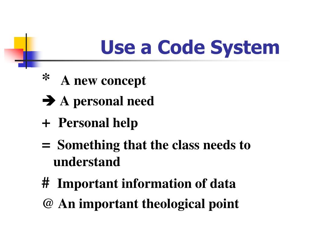 Use a Code System * A new concept A personal need + Personal help = Something that the class needs to understand # Important information of data @ An important theological point