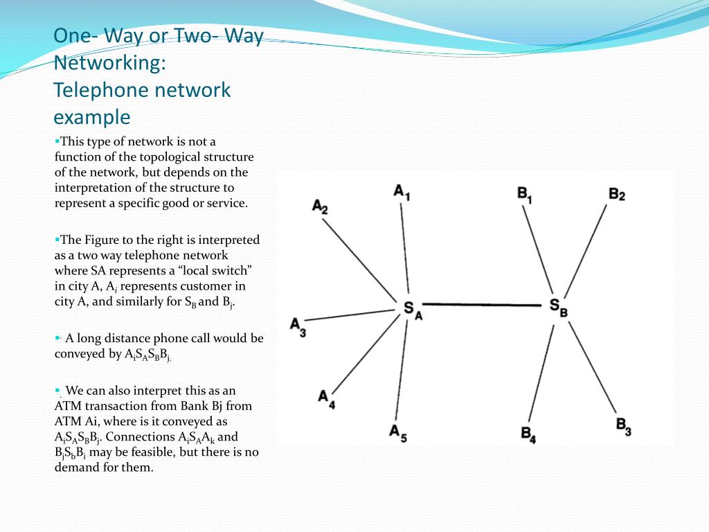 One- Way or Two- Way Networking: Telephone network example This type of network is not a function of the topological structure of the network, but depends on the interpretation of the structure to represent a specific good or service. The Figure to the right is interpreted as a two way telephone network where SA represents a “local switch” in city A, Airepresents customer in city A, and similarly for SB and Bj. .A long distance phone call would be conveyed by AiSASBBj. .We can also interpret this as an ATM transaction from Bank Bj from ATM Ai, where is it conveyed as AiSASBBj. Connections AiSAAk and BjSbBi may be feasible, but there is no demand for them.