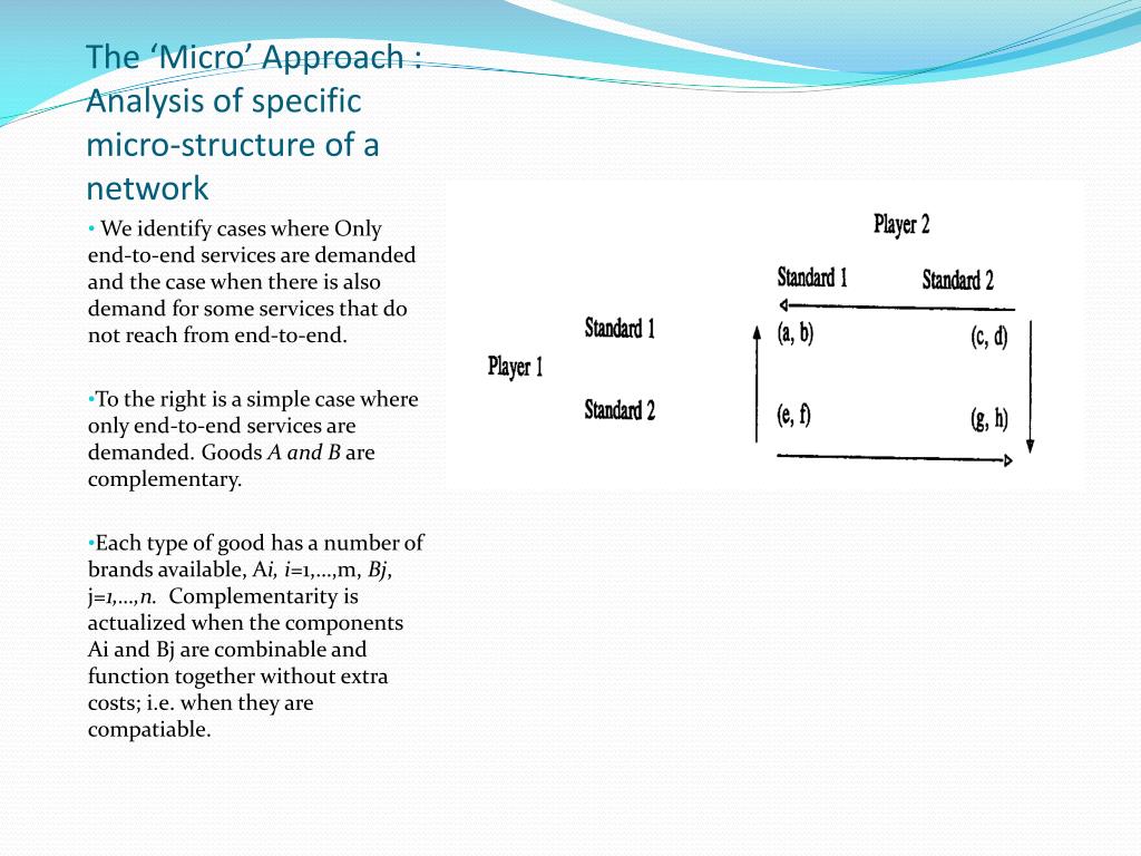 The ‘Micro’ Approach : Analysis of specific micro-structure of a network We identify cases where Only end-to-end services are demanded and the case when there is also demand for some services that do not reach from end-to-end. To the right is a simple case where only end-to-end services are demanded. Goods A and B are complementary. Each type of good has a number of brands available, Ai, i=1,…,m, Bj, j=1,…,n. Complementarity is actualized when the components Ai and Bj are combinable and function together without extra costs; i.e. when they are compatiable.