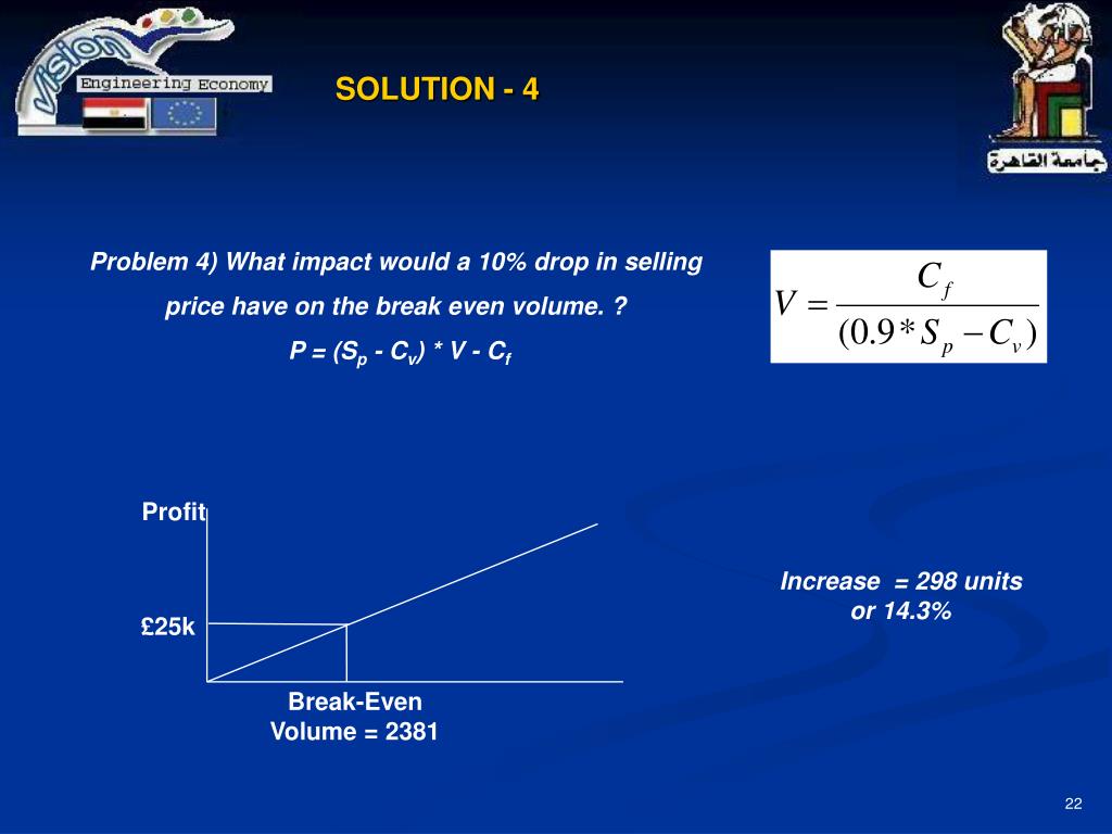 SOLUTION - 4 Problem 4) What impact would a 10% drop in selling price have on the break even volume. ? P = (Sp - Cv) * V - Cf Profit Increase = 298 units or 14.3% £25k Break-Even Volume = 2381
