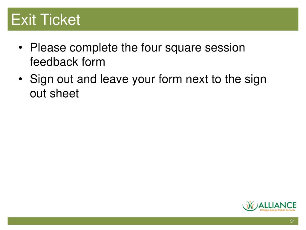 Exit Ticket • Please complete the four square session feedback form • Sign out and leave your form next to the sign out sheet