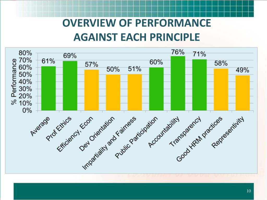 OVERVIEW OF PERFORMANCE AGAINST EACH PRINCIPLE • The performance against five of the nine principles, although below the average of 61%, was still within the adequate performance band. • Departments scored the highest against the principles of professional ethics (69%), accountability (76%) and transparency (71%). • Departments scored the lowest against the principles of fairness (51%) and representivity (49%). • Some pertinent issues about these 5 principles are highlighted in the next slides.