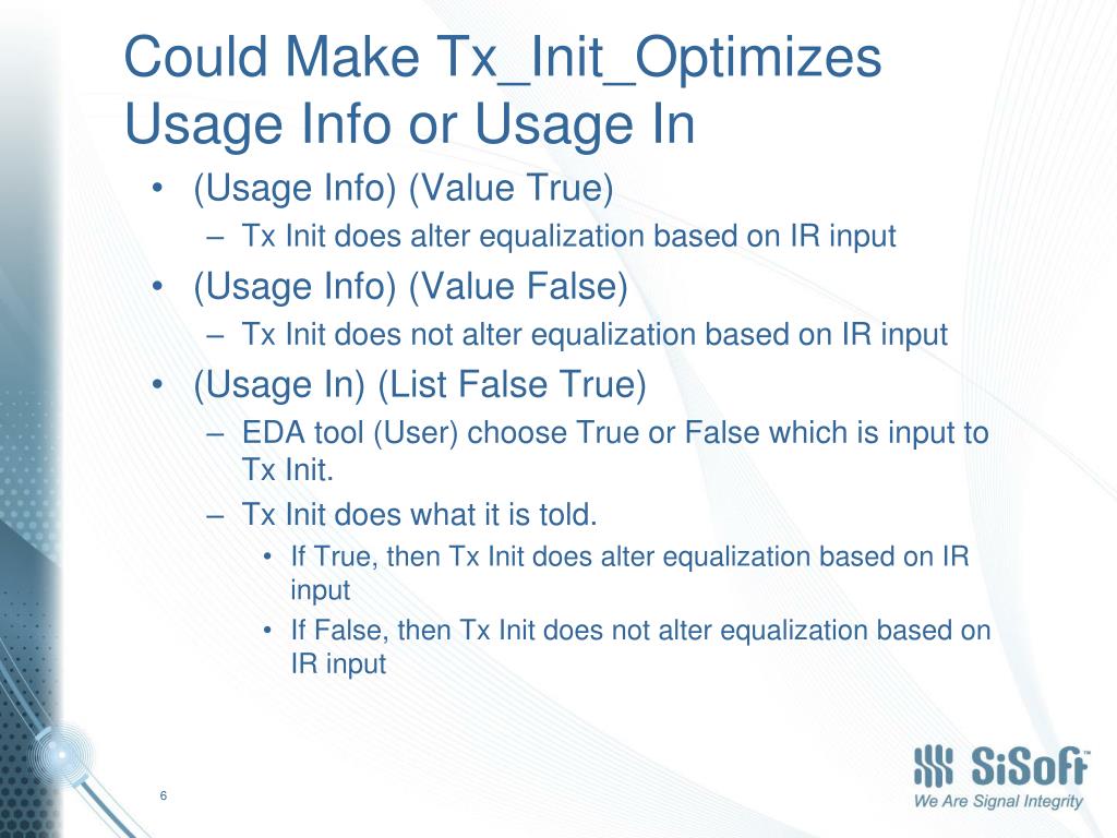 How to Fix It To maintain backward compatibility with existing flows, IBIS 7 should add a new required AMI Reserved Parameter “Tx_Init_Optimizes” (Type Boolean) (Usage Info) If True then Tx AMI_Init does change its filter equalization based on the impulse response of the channel. If False then Tx AMI_Init does not change its filter equalization based on the impulse response of the channel.