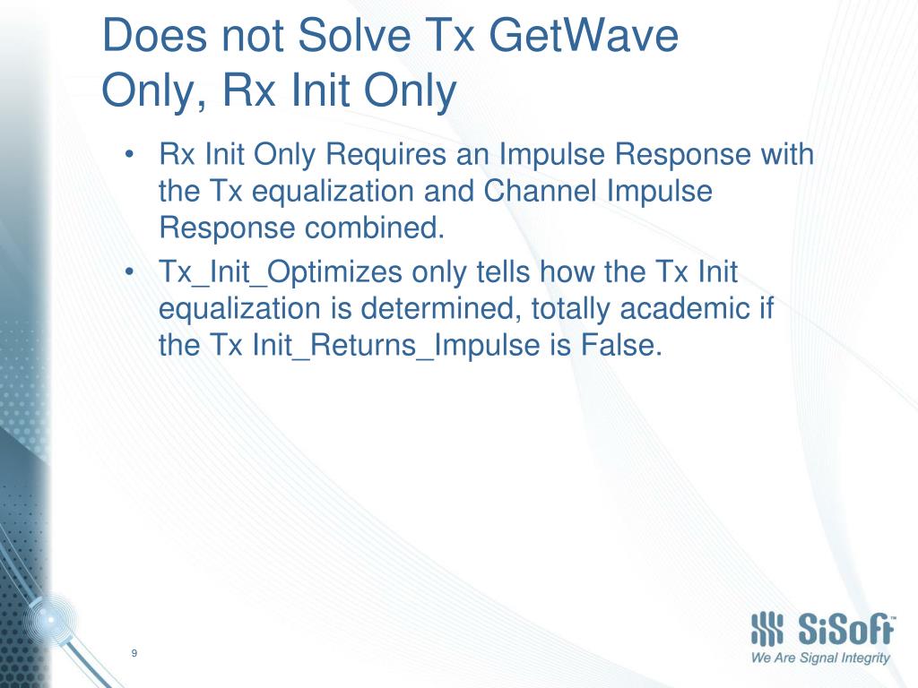 Does not Solve Tx GetWave Only, Rx Init Only Rx Init Only Requires an Impulse Response with the Tx equalization and Channel Impulse Response combined. Tx_Init_Optimizes only tells how the Tx Init equalization is determined, totally academic if the Tx Init_Returns_Impulse is False. 9