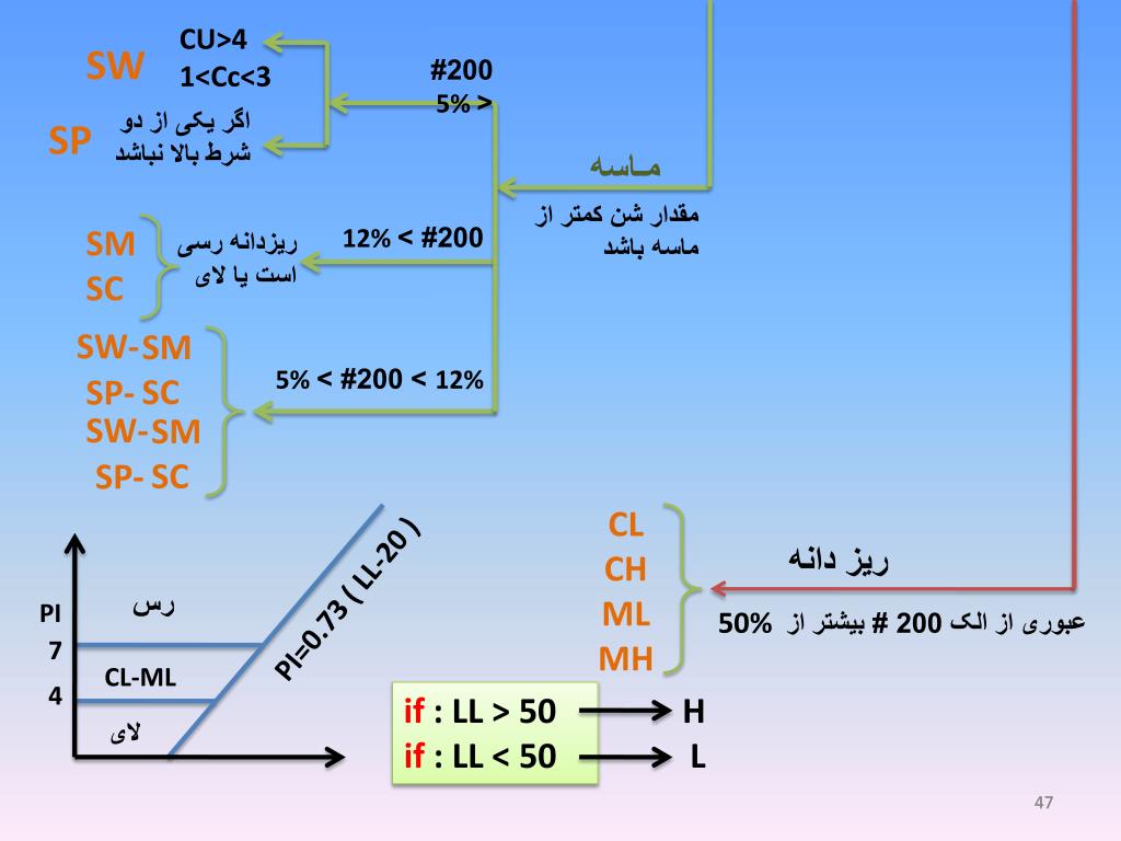 CU>4 1<Cc<3 SW 200# <5% اگر یکی از دو شرط بالا نباشد SP مـاسه مقدار شن کمتر از ماسه باشد SM SC 200# >12% ریزدانه رسی است یا لای SW- SM SC 12% > 200# >5% SP- SW- SM SC SP- CL CH ML MH ریز دانه PI=0.73 ( LL-20 ) رس PI عبوری از الک 200 # بیشتر از 50% 7 CL-ML 4 if : LL > 50 if : LL < 50 H L لای 47
