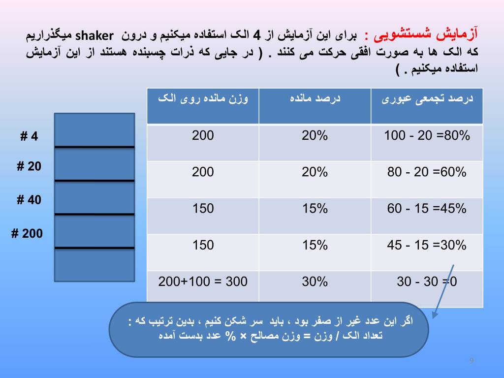 آزمایش شستشویی : برای این آزمایش از 4 الک استفاده میکنیم و درون shaker میگذراریم که الک ها به صورت افقی حرکت می کنند . ( در جایی که ذرات چسبنده هستند از این آزمایش استفاده میکنیم . ) 4 # 20 # 40 # 200 # اگر این عدد غیر از صفر بود ، باید سر شکن کنیم ، بدین ترتیب که : تعداد الک / وزن = وزن مصالح × % عدد بدست آمده