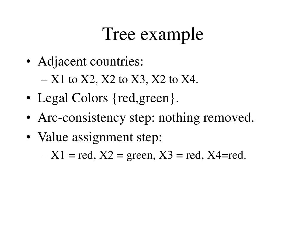 Tree example • Adjacent countries: • X1 to X2, X2 to X3, X2 to X4. • Legal Colors {red,green}. • Arc-consistency step: nothing removed. • Value assignment step: • X1 = red, X2 = green, X3 = red, X4=red.