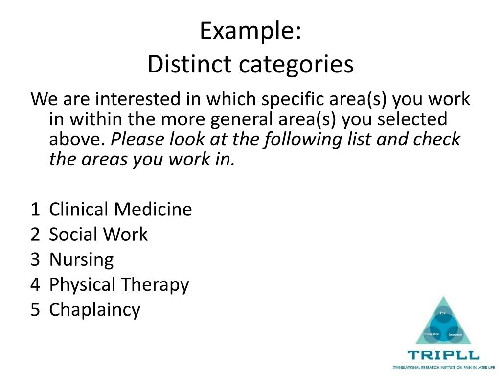 Example:Distinct categories We are interested in which specific area(s) you work in within the more general area(s) you selected above. Please look at the following list and check the areas you work in. 1 Clinical Medicine 2 Social Work 3 Nursing 4 Physical Therapy 5 Chaplaincy