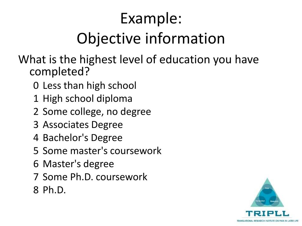 Example:Objective information What is the highest level of education you have completed? 0 Less than high school 1 High school diploma 2 Some college, no degree 3 Associates Degree 4 Bachelor's Degree 5 Some master's coursework 6 Master's degree 7 Some Ph.D. coursework 8 Ph.D.