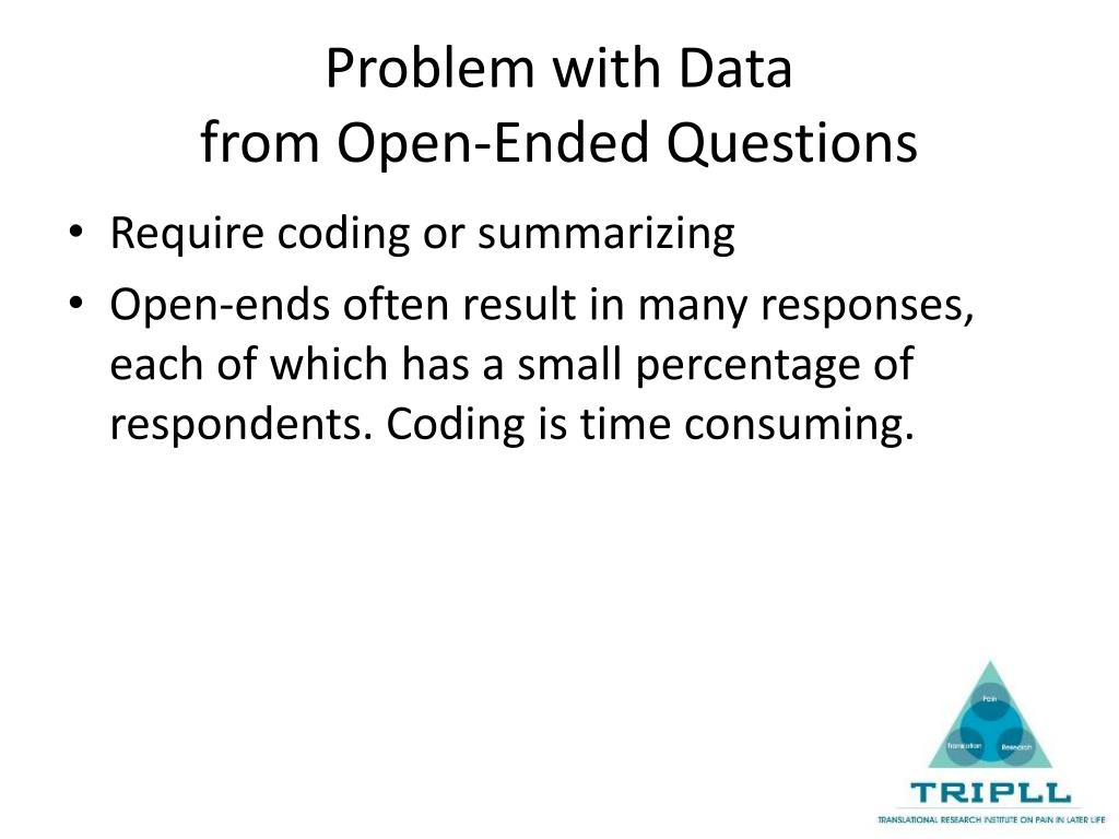 Open-Ended Questions • No answer categories • What did you like the most about this program? • What is the most important problem facing older people today? • They do not restrict how respondents will answer