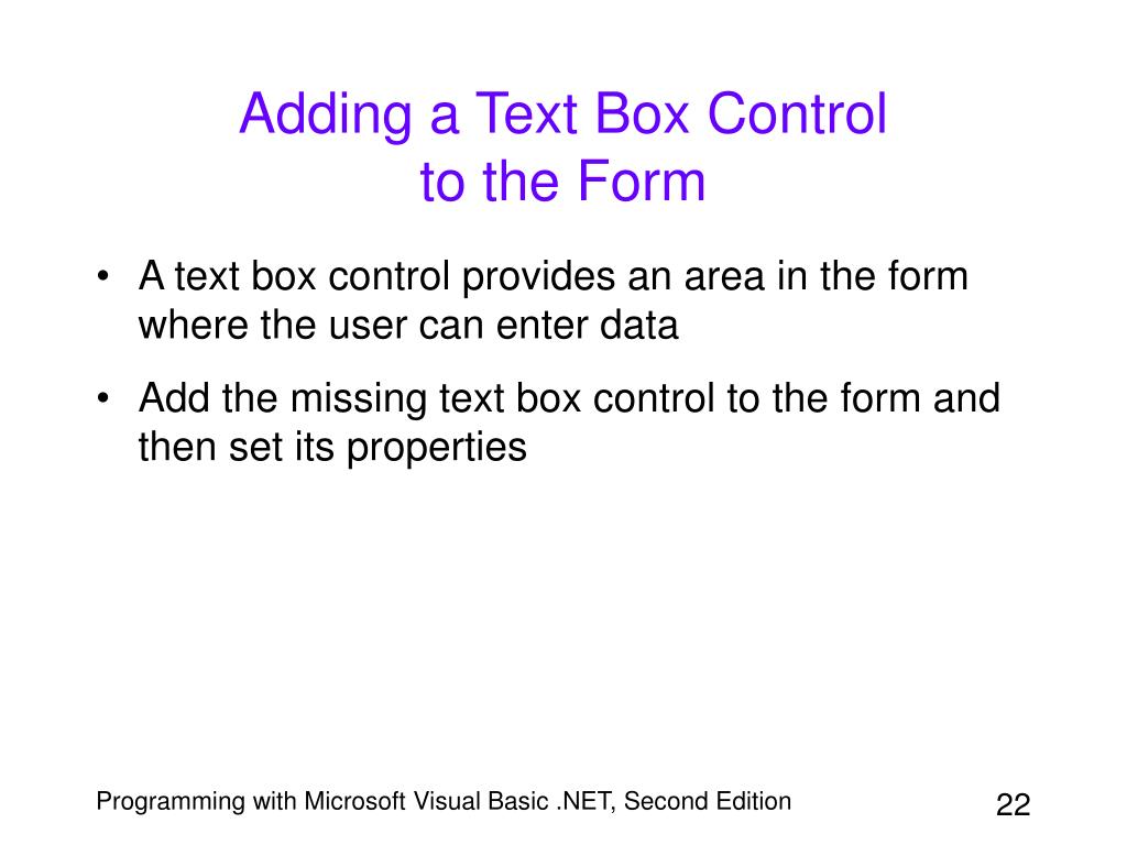Adding a Text Box Control to the Form • A text box control provides an area in the form where the user can enter data • Add the missing text box control to the form and then set its properties Programming with Microsoft Visual Basic .NET, Second Edition