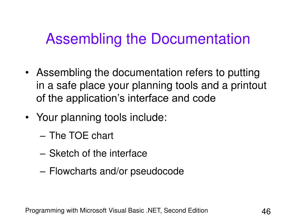 Assembling the Documentation • Assembling the documentation refers to putting in a safe place your planning tools and a printout of the application’s interface and code • Your planning tools include: • The TOE chart • Sketch of the interface • Flowcharts and/or pseudocode Programming with Microsoft Visual Basic .NET, Second Edition