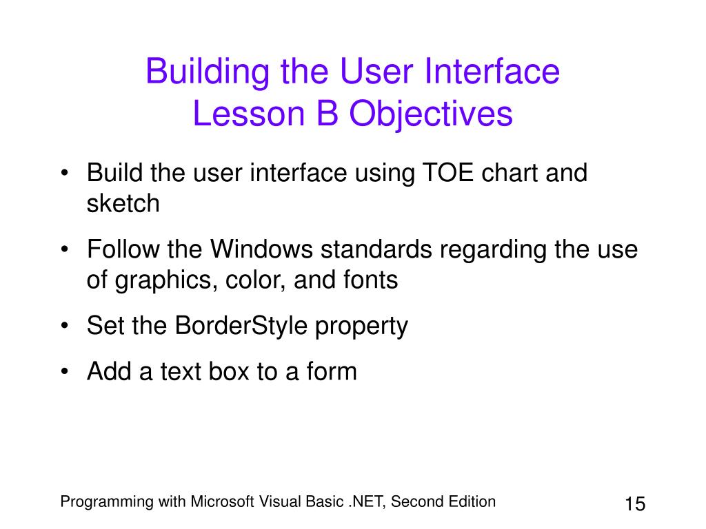 Building the User InterfaceLesson B Objectives • Build the user interface using TOE chart and sketch • Follow the Windows standards regarding the use of graphics, color, and fonts • Set the BorderStyle property • Add a text box to a form Programming with Microsoft Visual Basic .NET, Second Edition