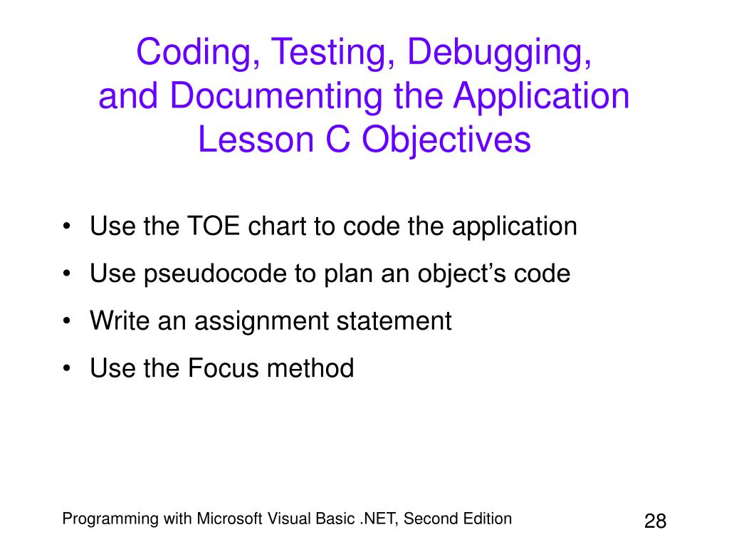 Coding, Testing, Debugging, and Documenting the ApplicationLesson C Objectives • Use the TOE chart to code the application • Use pseudocode to plan an object’s code • Write an assignment statement • Use the Focus method Programming with Microsoft Visual Basic .NET, Second Edition