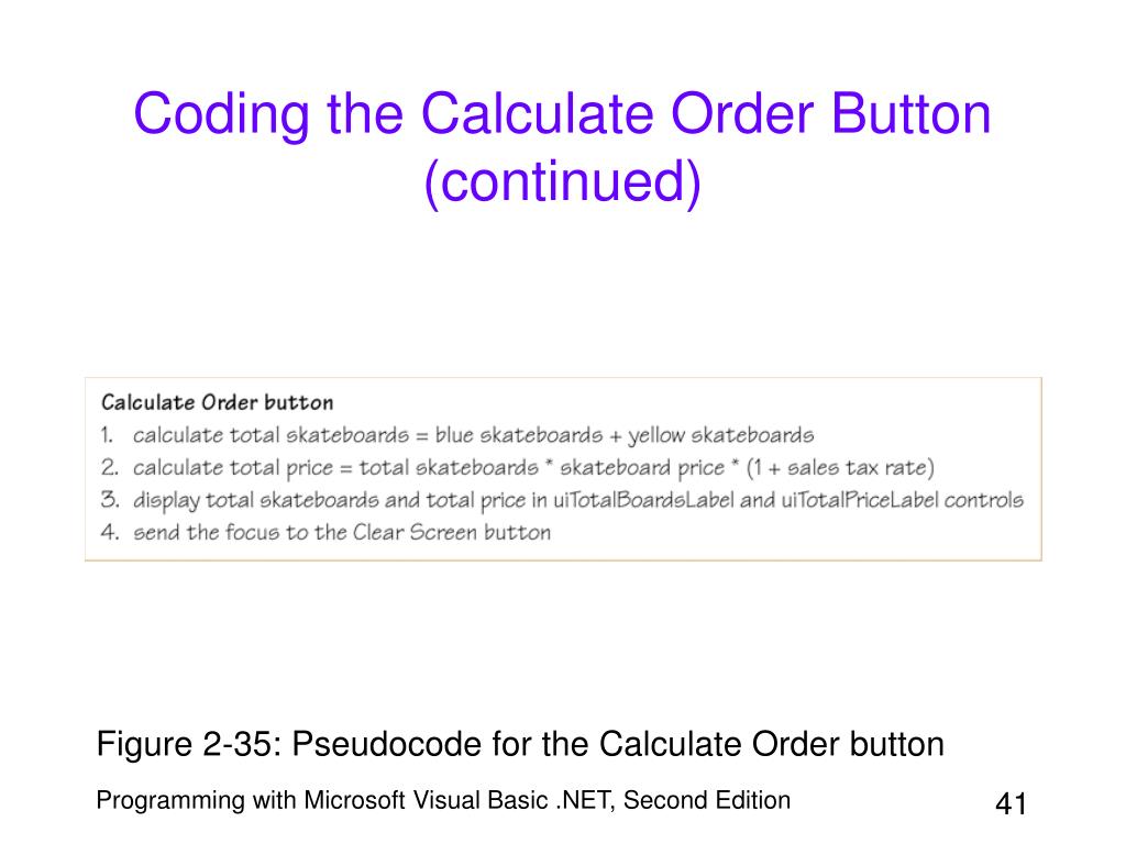 Coding the Calculate Order Button (continued) Figure 2-35: Pseudocode for the Calculate Order button Programming with Microsoft Visual Basic .NET, Second Edition