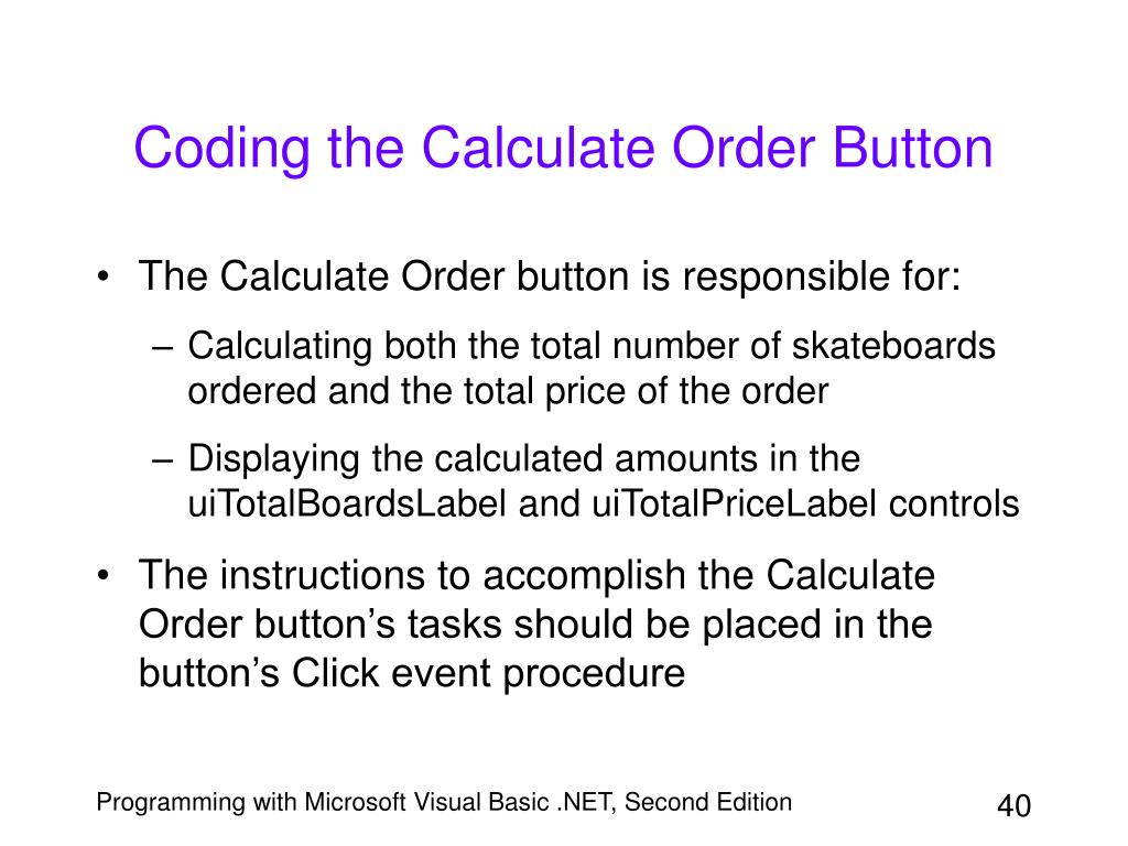 Coding the Calculate Order Button • The Calculate Order button is responsible for: • Calculating both the total number of skateboards ordered and the total price of the order • Displaying the calculated amounts in the uiTotalBoardsLabel and uiTotalPriceLabel controls • The instructions to accomplish the Calculate Order button’s tasks should be placed in the button’s Click event procedure Programming with Microsoft Visual Basic .NET, Second Edition