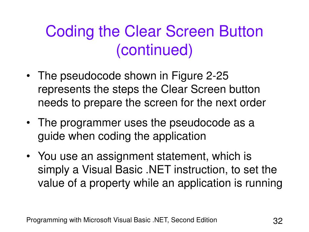Coding the Clear Screen Button (continued) • The pseudocode shown in Figure 2-25 represents the steps the Clear Screen button needs to prepare the screen for the next order • The programmer uses the pseudocode as a guide when coding the application • You use an assignment statement, which is simply a Visual Basic .NET instruction, to set the value of a property while an application is running Programming with Microsoft Visual Basic .NET, Second Edition