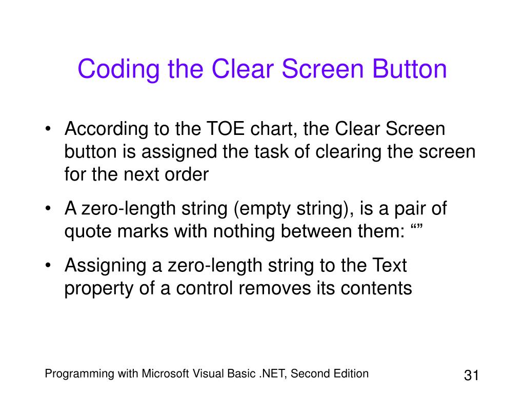 Coding the Clear Screen Button • According to the TOE chart, the Clear Screen button is assigned the task of clearing the screen for the next order • A zero-length string (empty string), is a pair of quote marks with nothing between them: “” • Assigning a zero-length string to the Text property of a control removes its contents Programming with Microsoft Visual Basic .NET, Second Edition