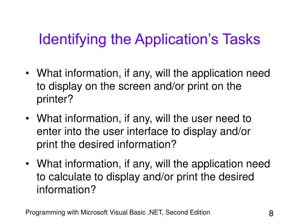 Identifying the Application’s Tasks • What information, if any, will the application need to display on the screen and/or print on the printer? • What information, if any, will the user need to enter into the user interface to display and/or print the desired information? • What information, if any, will the application need to calculate to display and/or print the desired information? Programming with Microsoft Visual Basic .NET, Second Edition