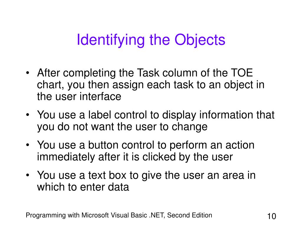 Identifying the Objects • After completing the Task column of the TOE chart, you then assign each task to an object in the user interface • You use a label control to display information that you do not want the user to change • You use a button control to perform an action immediately after it is clicked by the user • You use a text box to give the user an area in which to enter data Programming with Microsoft Visual Basic .NET, Second Edition